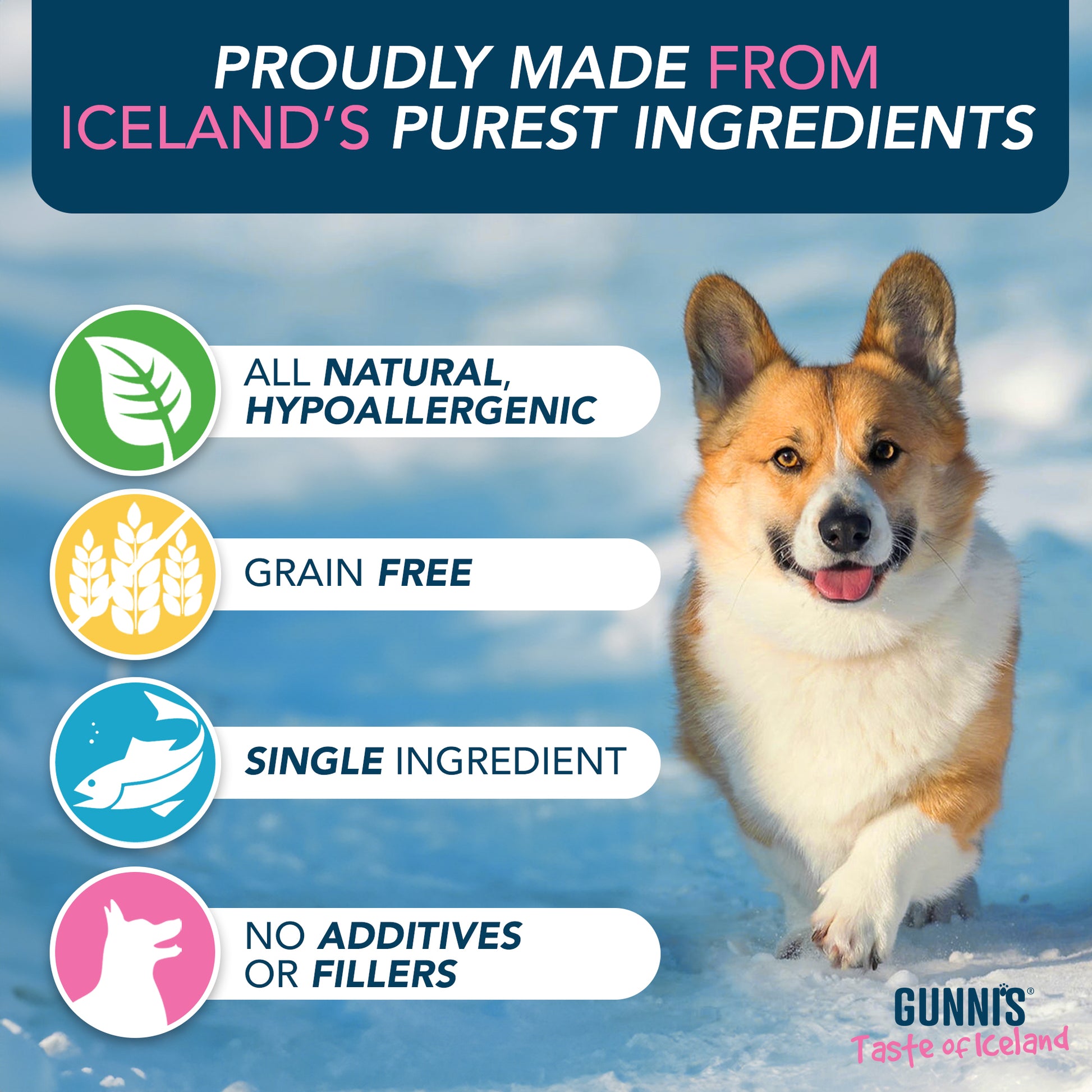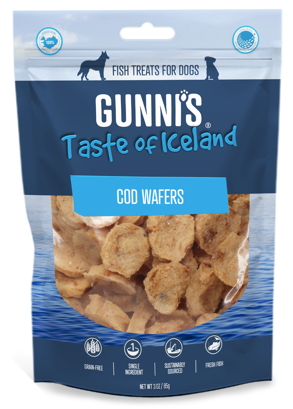 Sustainably made from MSC-certified Icelandic cod using renewable geothermal energy, Gunni’s Pure Cod Wafers are hypoallergenic, grain-free, and gluten-free — ideal for sensitive dogs. Suitable for puppies (16+ weeks) through to seniors.